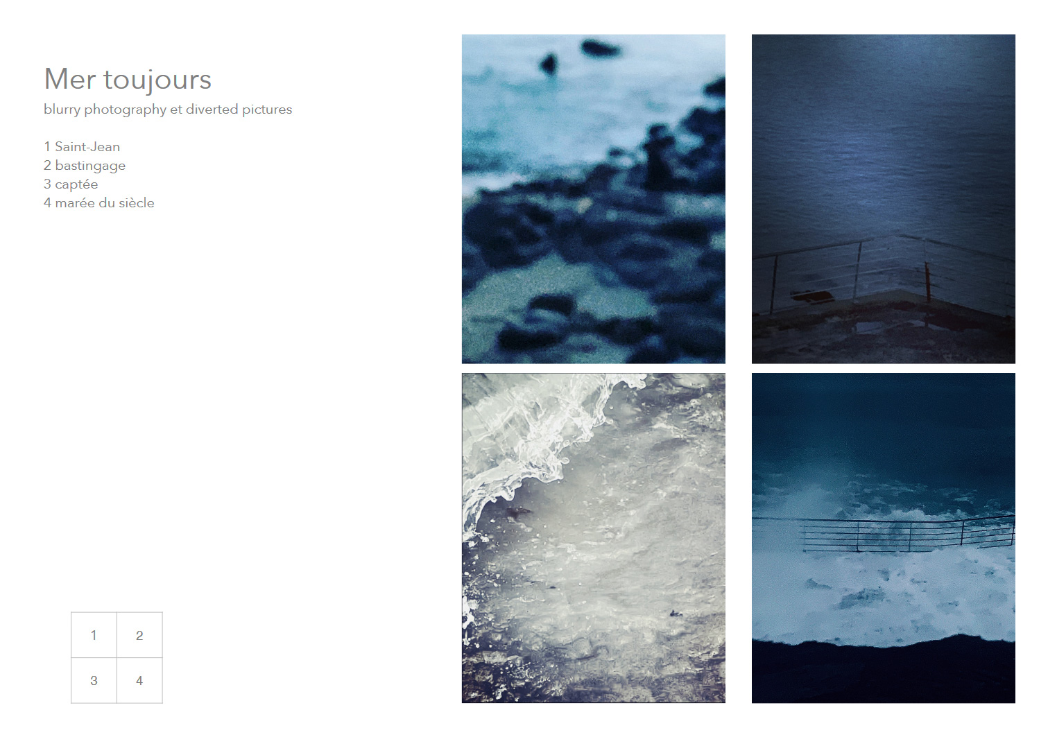 Il est question de ciel, de mer, d’étendues, vastes plaines souvent marines, à la lueur du couchant, du levant, faufilée parmi les ombres portées de la nuit presque tombée et celles de l’aube qui promettent tant. Dehors, mon atelier. Je me soucie peu de l’optique « savante », mon smartphone en poche, saisir l’instant est ma préoccupation immédiate, clichés à outrance jusqu’à l’obtention graphique, suffisamment floue, autrement dit en anglais « blurdy », puis détournée, manipulée avec la palette des filtres. Images fluzzy des séries comme une peinture, ciels, entre chiens & loups… Quête permanente d’instantanés d’impressions, moisson rapportée à l’atelier, dans la maison.